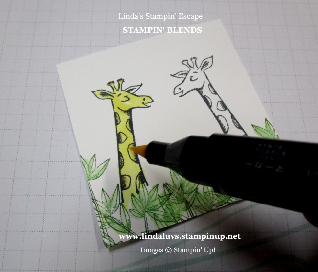 We used the Stampin’ Blends to color our giraffe … the Light Daffodil Delight and the Light Crumb Cake for the spots. You’ll see this better on the finished card.