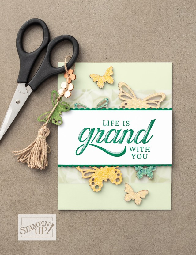 The pretty little butterflies are our Butterfly Wooden Elements that you can get for FREE during our Sale-a-bration period. The spectacular greeting comes from our “Life is Grand” stamp set which is found in our Occasions Catalog on page 17.