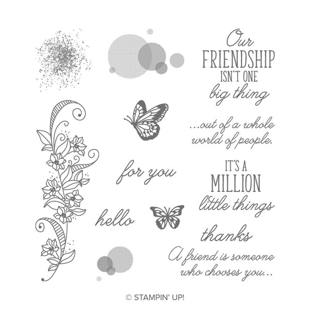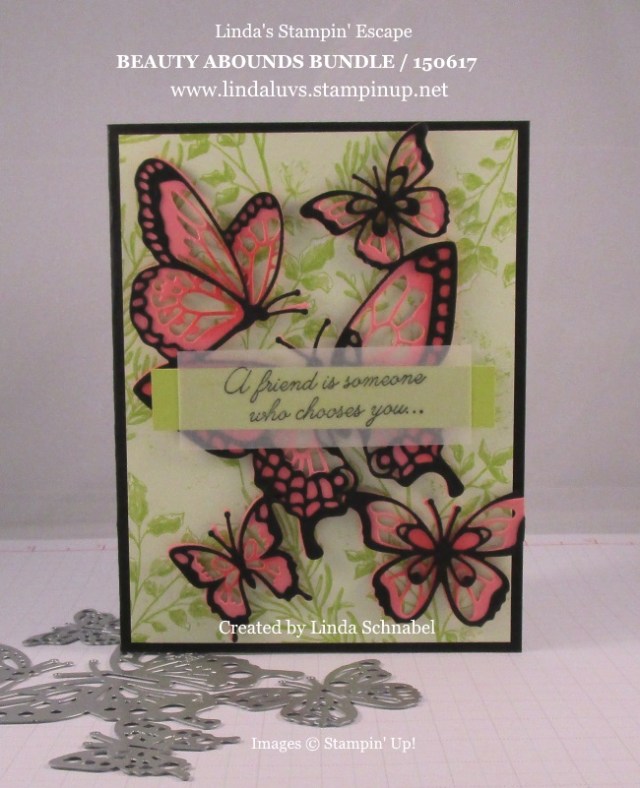 The greeting “A friend is someone who chooses you …” comes from the Beauty Abounds stamp set and inside it says “out of a whole world of people”. So besides the beautiful butterflies which were a favorite of my Mom’s, the verses in this bundle are outstanding.
