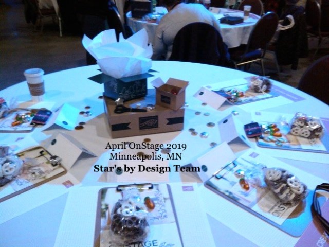At OnStage we get a bag (you can see it on the table… a NEW In-Color) filled with goodie; a stamp set, pens, a journal, a punch, some file folders and more … awesome stuff for our business/hobby. During the day we watch great demonstrations by our fellow demonstrators highlighting new products AND we get to play with some of the new stuff ourselves with Make -n- Takes.