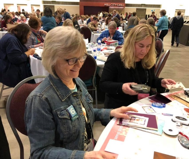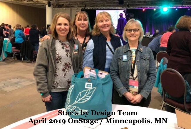 At OnStage we get a bag (you can see it on the table… a NEW In-Color) filled with goodie; a stamp set, pens, a journal, a punch, some file folders and more … awesome stuff for our business/hobby. During the day we watch great demonstrations by our fellow demonstrators highlighting new products AND we get to play with some of the new stuff ourselves with Make -n- Takes.