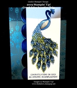 The creator of this card did a beautiful job stamping and coloring the peacock. The greeting also comes from the stamp set that is included in the suite and / or bundle and is embellished with the Blueberry Bliss Foil paper.