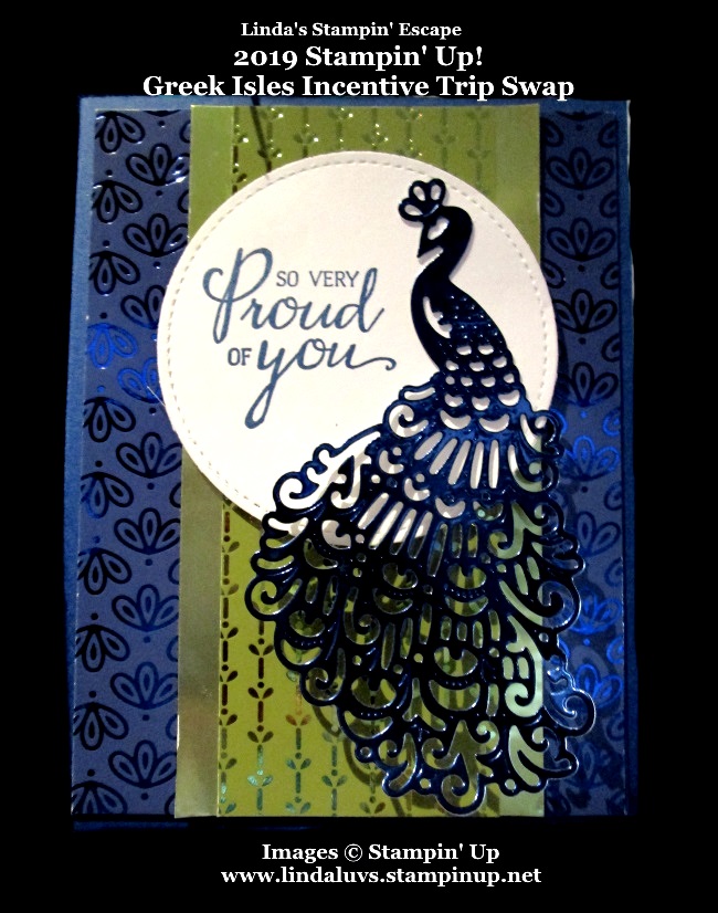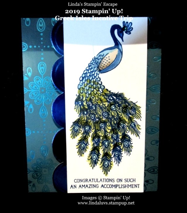 Today I’d like to share with you, two beautiful cards that were on the “Swap Boards” on the Stampin’ Up! Greek Isles Incentive trip created with the Noble Peacock product suite. I chose these two to share with you today because one features the stamped peacock and the other – the die cut peacock. Both cards include the Noble Peacock Specialty Designer paper as well.