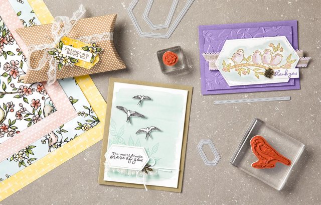 You could even cut the beautiful images out of the Designer Series Paper just as we did in The World Needs More of You sample to explore your creativity. The sky is the limit with this beautiful suite, get ready to fly through every occasion with sweet sentiments and gorgeous birds.
