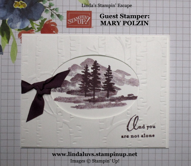 Today I have a pretty card to share with you from my friend and fellow demonstrator Mary Polzin … a swap card she made with the Waterfront stamp set. The scene is stamped with a now retired color (Fresh Fig) but you could use Blackberry Bliss, Pretty Peacock, Mossy Meadow or the beautiful Shaded Spruce.