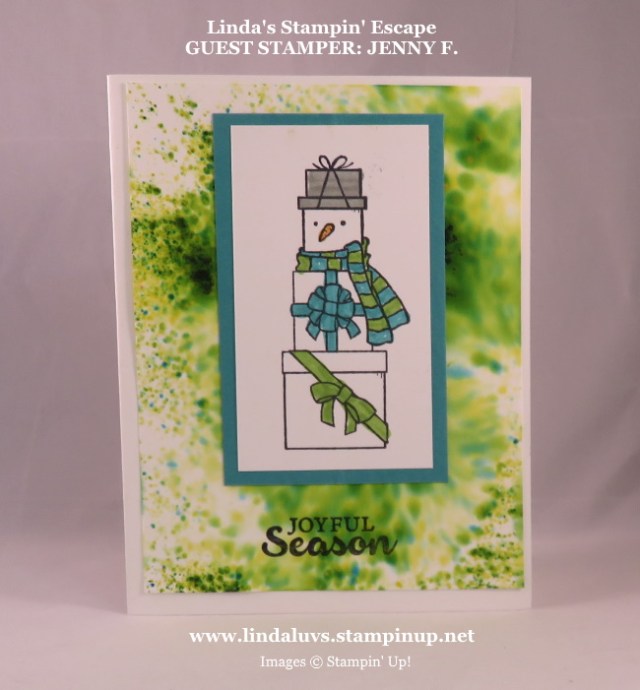 She used the cute snowman image and created the amazing background with the Pigment Sprinkles. The Pigment Sprinkles are watercolor pigment crystals in exclusive Stampin’ Up! colors. Mix them with water to make watercolor backgrounds and washes, and use them for other watercoloring techniques.