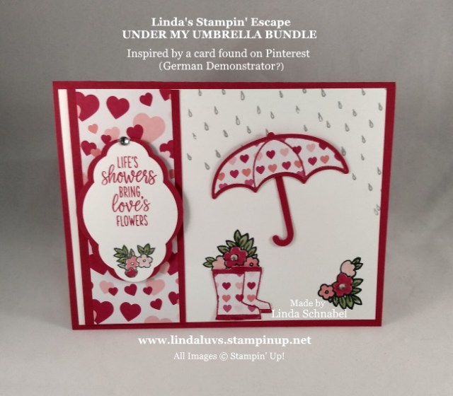 This is one of the cards that my February Stamp Club made … this card ties in with the products we used last month and introduces the Under My Umbrella bundle. The bundle includes the stamp set and a punch that punches the umbrella.