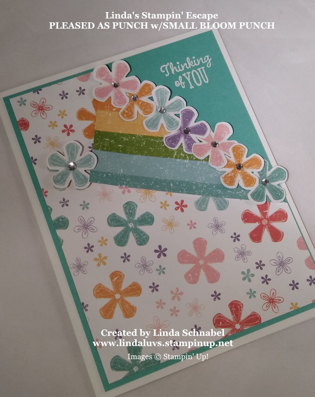 The flowers are punched using the Small Bloom Punch which you can earn FREE during Sale-a-bration with a qualifying amount. Each bloom is adorned with a Rhinestone gem in the center.