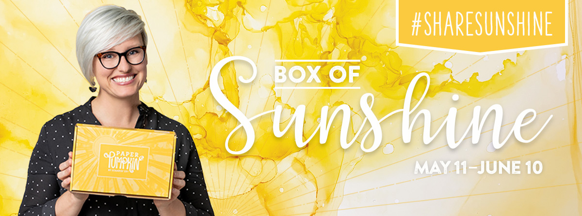 Time for some fun … Inspired by Stampin’ Up!’s CEO Sara Douglass, this June Paper Pumpkin Box of Sunshine kit is here to help you #sharesunshine. When you’ve made all the cards, fill the box with yellow goodies, add the included adhesive label, address it to someone special, and brighten their life with a little sunshine!