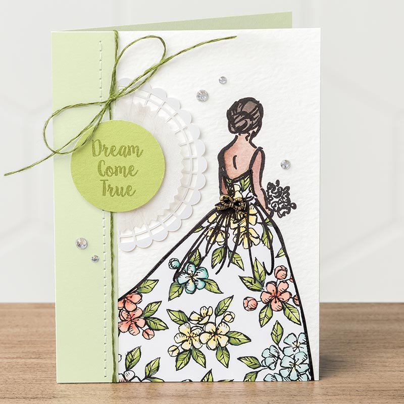 I love that the dress was stamped onto the Bird Ballad designer paper and then cut out and dressed up our bride. Now … that’s a quick way to introduce a lot of color onto your card without doing all the work!!