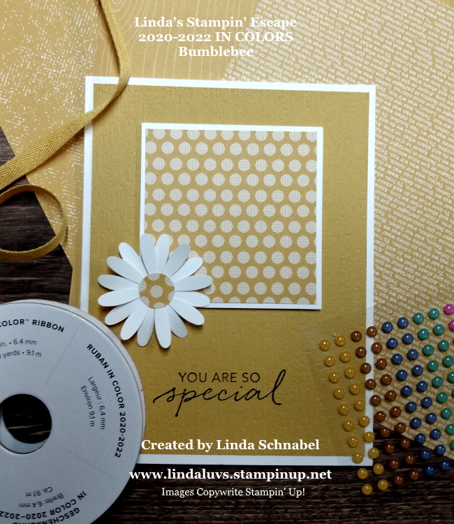 I made all of the samples using the 2020-22 In Color Designer paper with the “dots” and teamed it with different sentiments from the New “Tasteful Touches” stamp set. Let me introduce you to “Bumblebee” …
