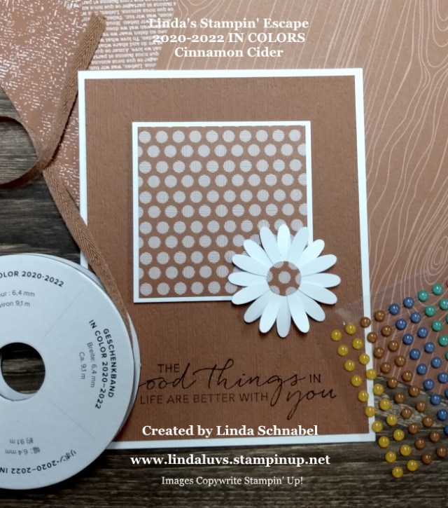 The card features one 2-1/2″ x 2-1/2″ piece of pattern paper from the 2020-22 In Colors Designer Series paper. The photo shows the other patterns along with the ribbon and the enamel dots.
