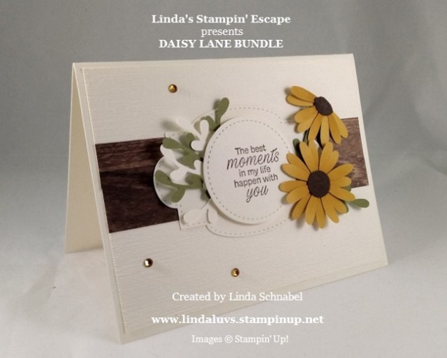 The flowers and greenery frame the stamped greeting cut with a circle die and layered with the Stitched So Sweetly die … these are then layered onto a “wood” strip of designer series paper.