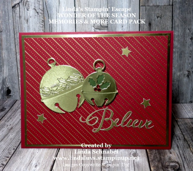 This is one of my favorites … I just trimmed down this pretty card that was red and gold, layered some gold behind it and cut out two of the bells from the Sounds of the Season Dies. The “Believe” and Stars come with the Card Pack!