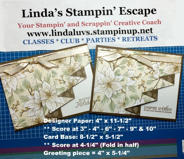 What did you think … ?? This is the type of card that looks fancy but is pretty easy to make. Any designer paper could be used for this style of card. I chose to use the Poinsettia Place suite… such a pretty pattern and a natural background to accent the fold.