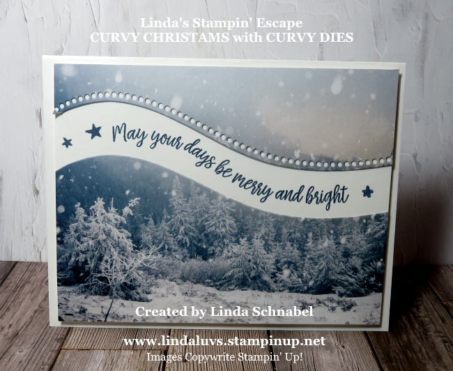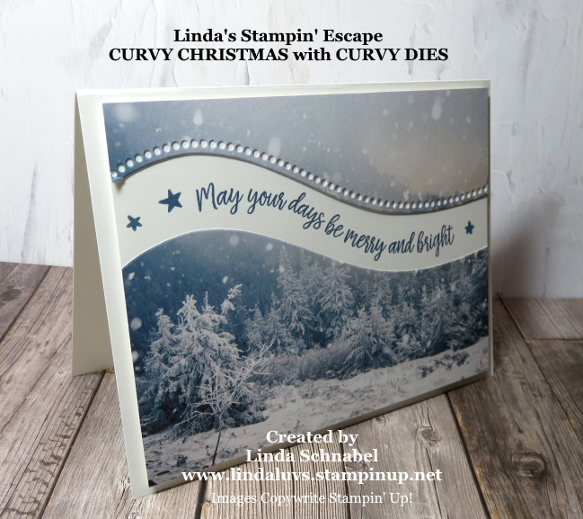 As promised … I am back today with my “Curvy Christmas” card. I can’t believe how easy this was to use and how cool the card turned out. Since I’m going Christmas, I chose the Feels Like Frost Designer Series paper. Once run through the Stampin’ Cut -n- Emboss machine and the Curvy Dies delivered this ……