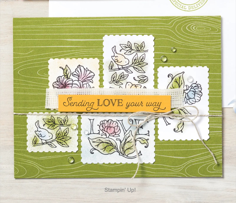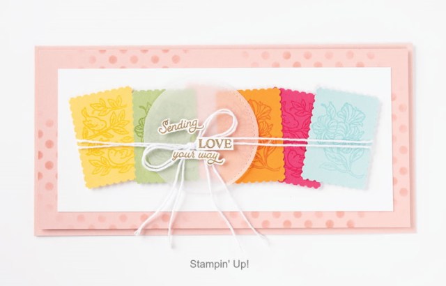 There are so many possibilities with the Posted for You Bundle … Create postcards and greeting cards with the delicate line-art and postage stamp-sized images from the Posted for You Stamp Set. The subtle images stamped onto each of the different colors creates such a fun card and it’s all tied together with a little Bakers Twine. The greeting is highlighted with a piece of Vellum cardstock!