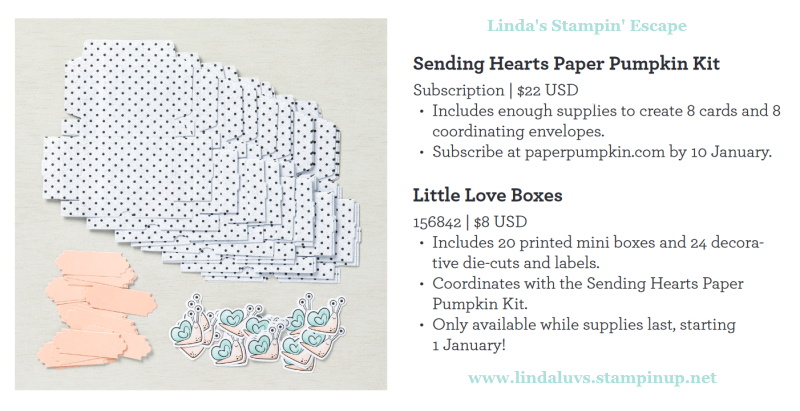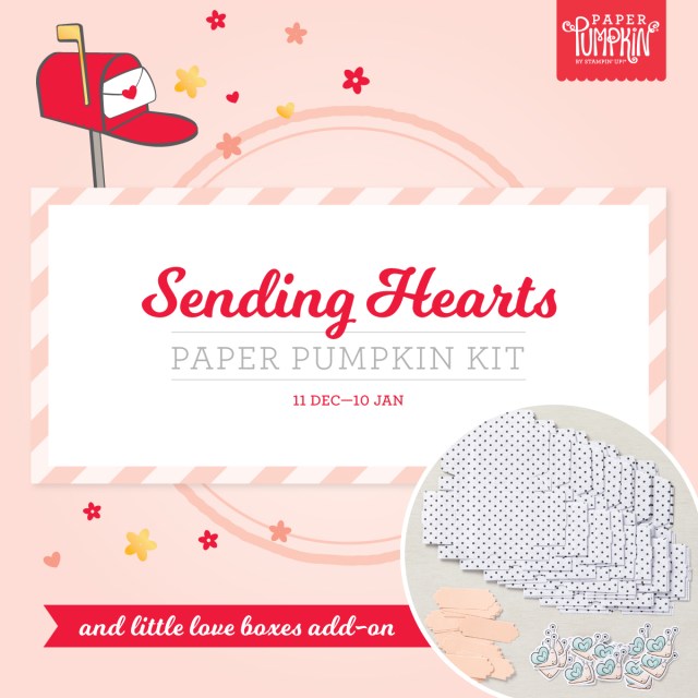 Purchase the Little Love Boxes add-on to the Sending Hearts Paper Pumpkin Kit on stampinup.com, or by placing an order with me, your demonstrator or from my online store. The add-on will be available starting 1 January, while supplies last. You must be a Paper Pumpkin subscriber to order the add-on. ** Little Love Boxes (156842)