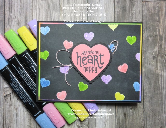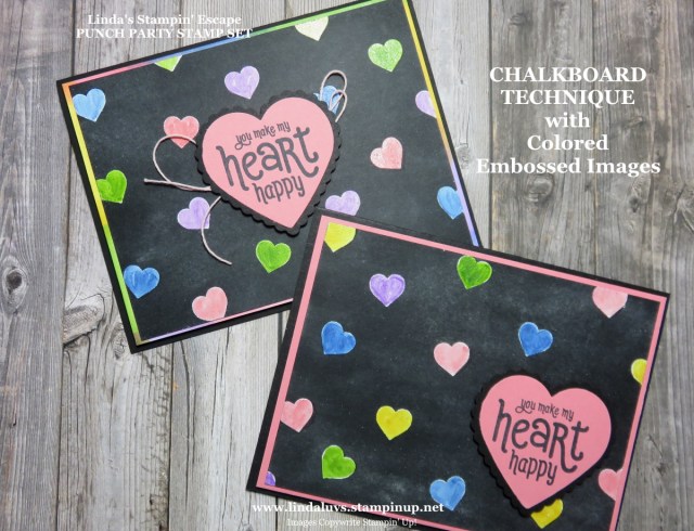 Today I have two techniques in one card for you; the Chalkboard technique and the “Coloring Embossed Images” … and together they just pop off the page! This is the card I created for my technique Tuesday LIVE last night, but I have a surprise … I have the other card that I suggested on the video! I am using the PUNCH PARTY stamp set again.