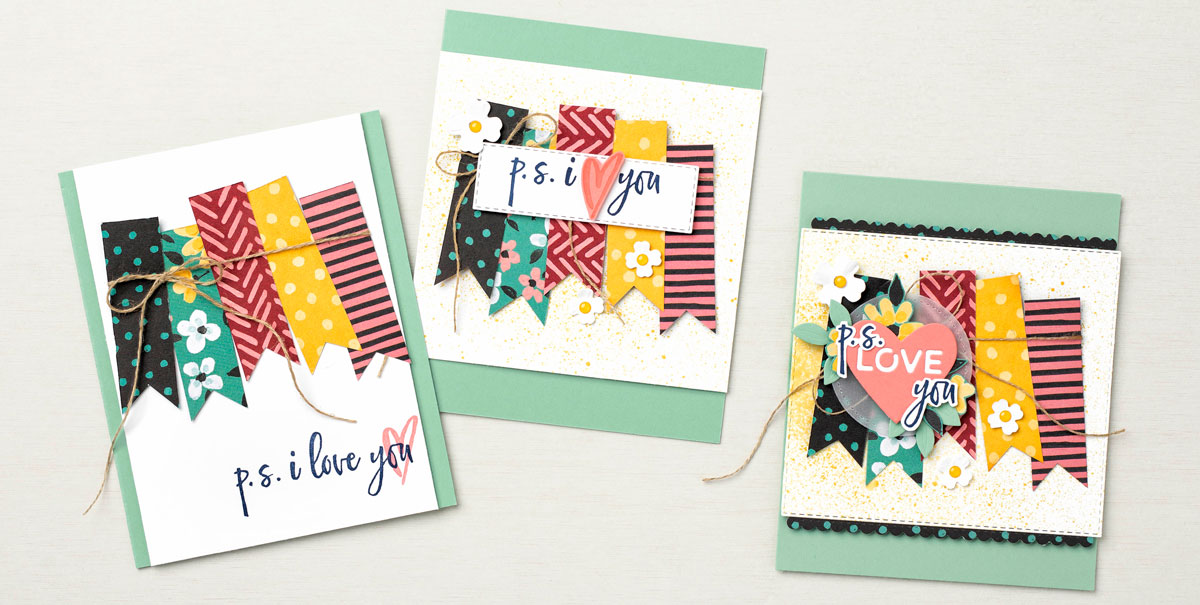 We begin with the card on the left and the Mint Macaron card base. Stamp the sentiments in Night of Navy and the heart image in Flirty Flamingo ink using the stamp-off technique. Then, punch five banners from our Flower & Field Designer Series Paper using the Banners Pick a Punch. Adhere the banners to the card front using Stampin’ Dimensionals and tie with a Linen Thread bow. Done! You have the perfect, easy card to let someone know you care.
