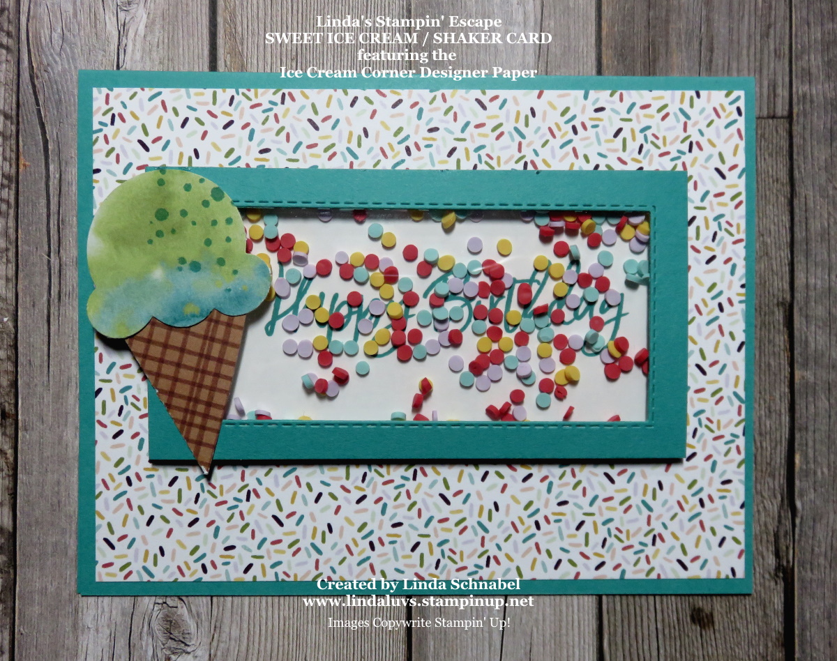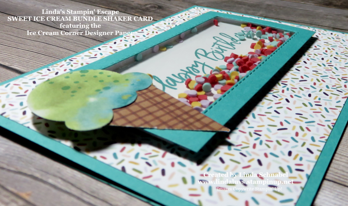 There is nothing better than sprinkles on ice cream or inside your “Shaker Cards” … and that is what I have for you today along with several other Ice Cream cards that highlight the Ice Cream Corner Designer Series paper. This tasty treat of a designer paper will be disappearing as fast as ice cream at my house! Let’s begin with our Shaker card …