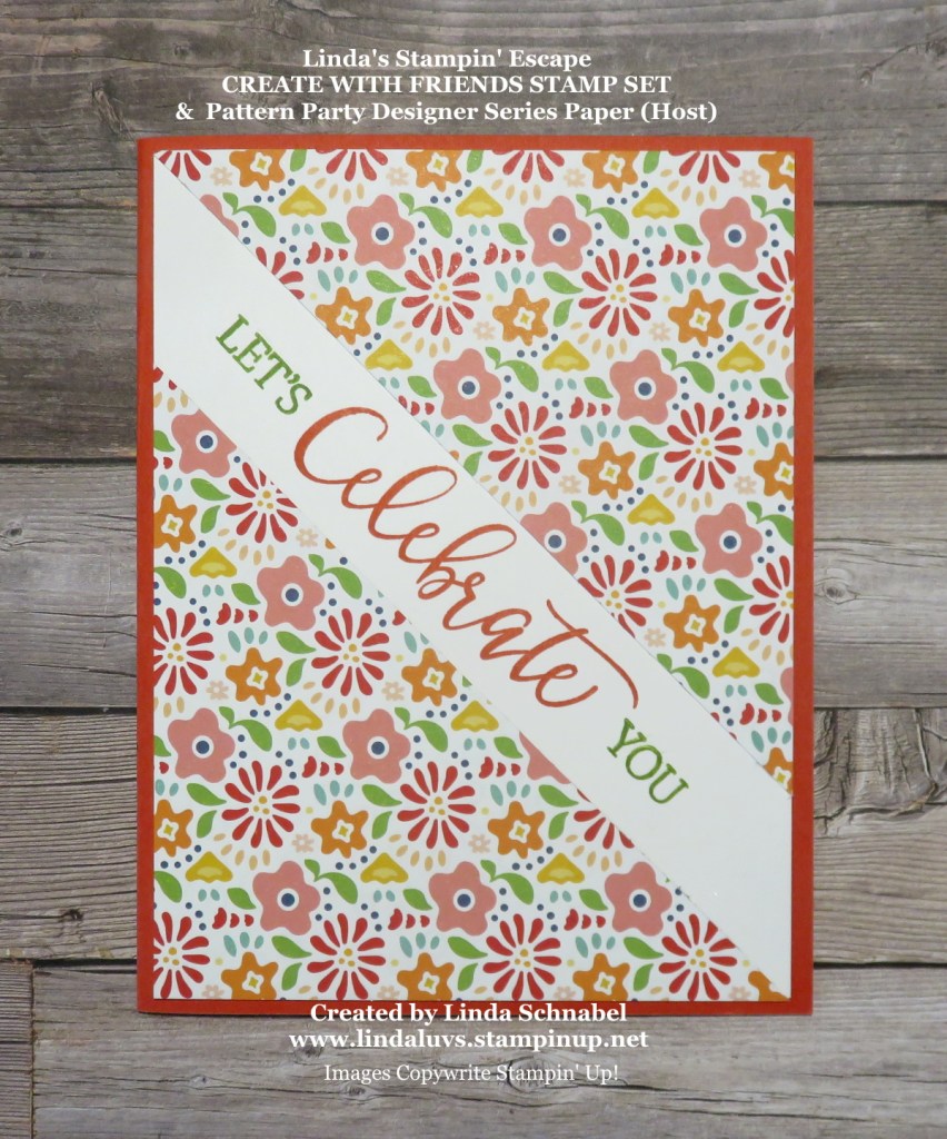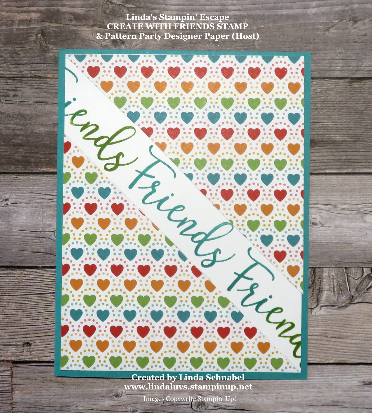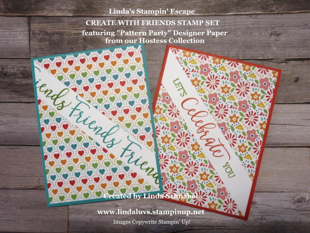 Happy Friday!! I have two cards to share with you today featuring the “Pattern Party” Designer Series paper from our Hostess Collection and the fun and fabulous “Creating with Friends” stamp set! Well … I think it’s fun and fabulous!!