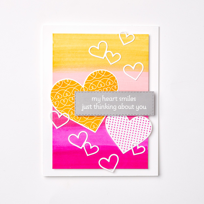The next card is bright and colorful and ready to cheer up anyone who receives it! The background was created simply with our blender pens and creates the perfect backdrop to the whimsical hearts … I just love the polka dots ❤ The Basic White die cut hearts add a playful touch and creates a softness to the card.