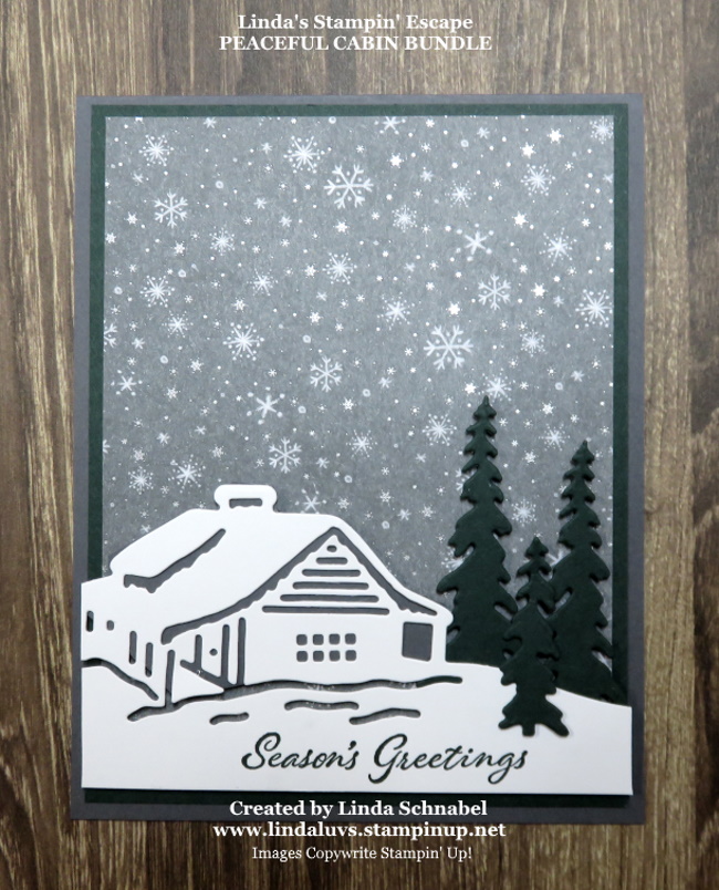 Although the trees look black they are actually Evening Evergreen as is the mat behind this beautiful paper. The cabin is cut from Basic White and all of them are popped up with our Stampin’ Dimensionals …