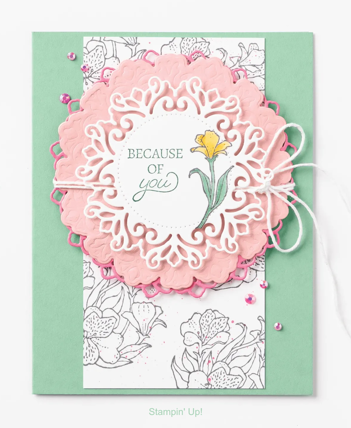 I used the die on the bottom left (large outer die) to cut the Basic White mat, and then again with the die on the bottom left to die cut the delicate Mint Macaron pattern and layered them together. I stamped my greeting and die cut that as well.