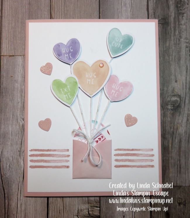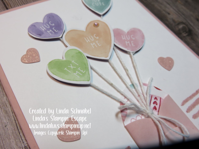 Now how cute is a bouquet of balloons … I mean hearts! I just put a Stampin’ Dimensional on the back of the heart and then stuck the bakers twine to the dimensional. Once I had all my twine on the hearts, I needed something to “tie them down” … so I pulled out the envelope die and cut it out from one of the designer paper patterns.