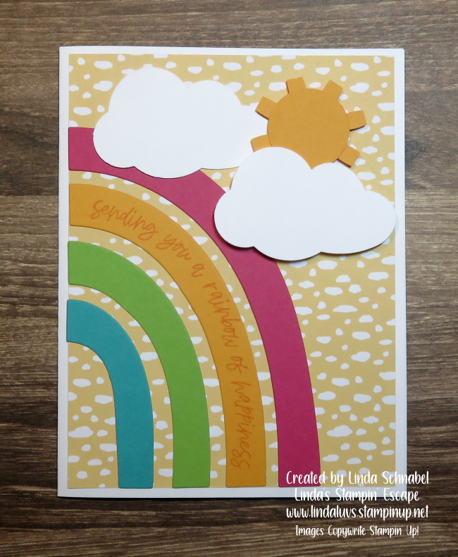 The clouds were punched from the “Cloud Punch” and are layered behind and in front of the sun to create some beautiful depth and texture to the card. This was such a fun and easy card to make and who can resist the colors of the rainbow!!