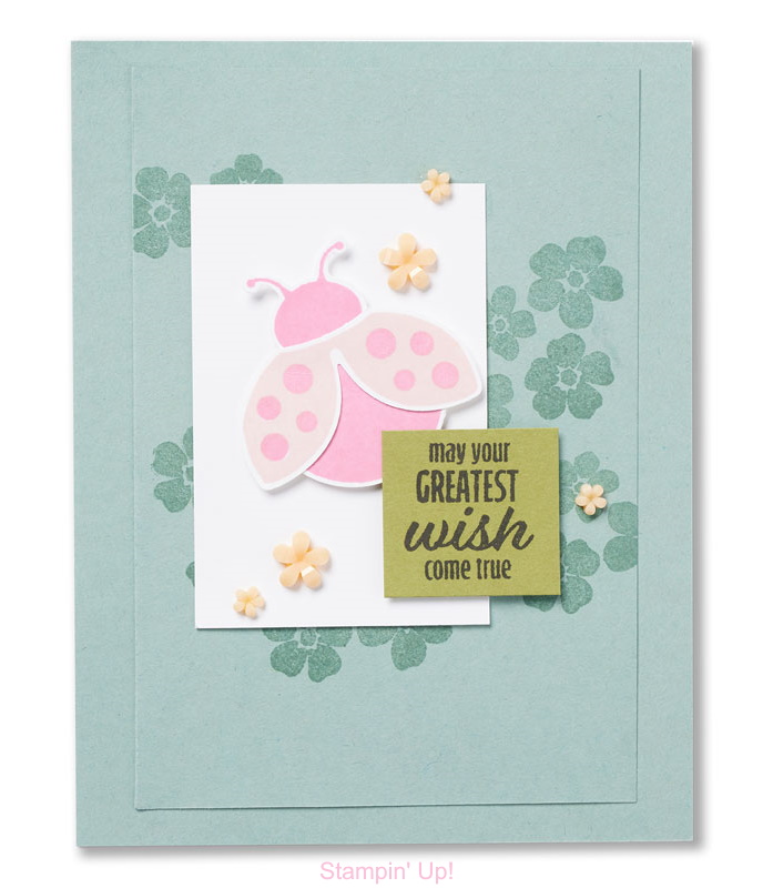 3. On the 3-1/2” x 5” (8.9 x 12.7 cm) Soft Succulent piece, randomly stamp the small flowers from the Hello Ladybug Stamp Set in Soft Succulent ink.
