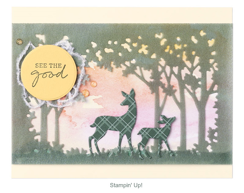 You’ll love how the stamps and dies work together to easily create an ornate, framed panoramas, such as a lone deer or a colorful sunset peeking out from behind a grove of die-cut trees. Here the beautiful background is one of my favorite designer papers; the New Horizons Designer Paper.
