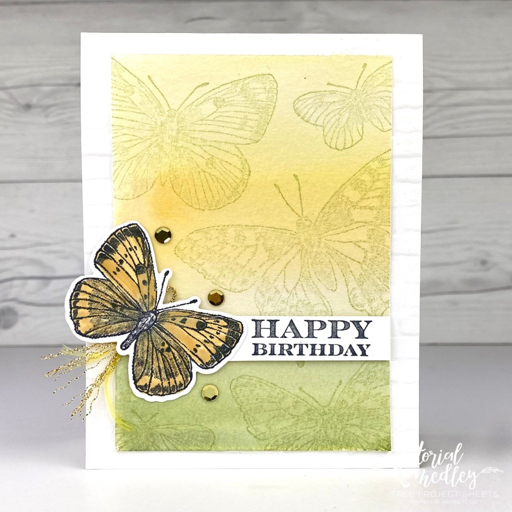 • Stamp the butterfly background onto the dry watercolor paper using Soft Sea Foam ink.