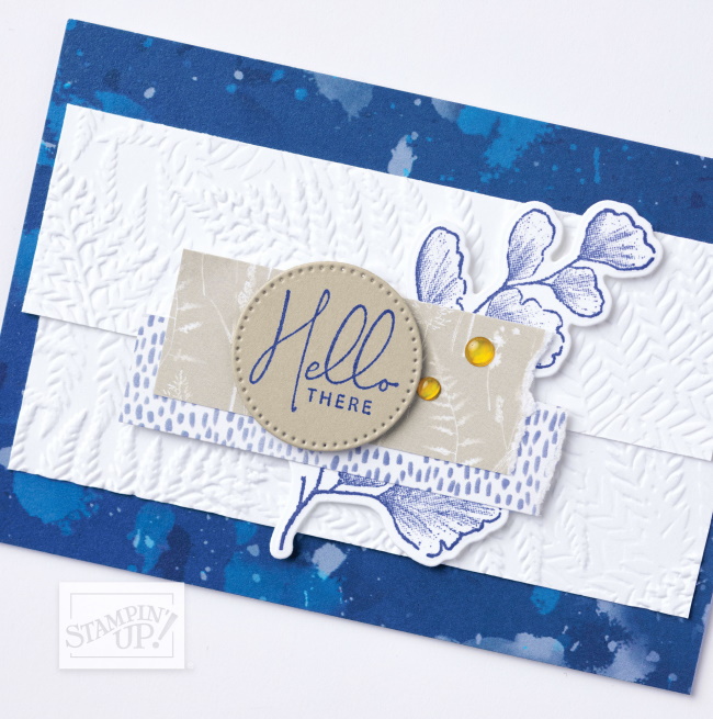 You begin by using the Sun Prints Designer Paper and the beautiful embossing on the Basic White cardstock using the Fern using the 3D embossing folder. Then we have a few more layers of designer paper. The fern and greeting were stamped in Starry Sky one of our newest In Colors and then adorned with the Glossy Dots Assortment.