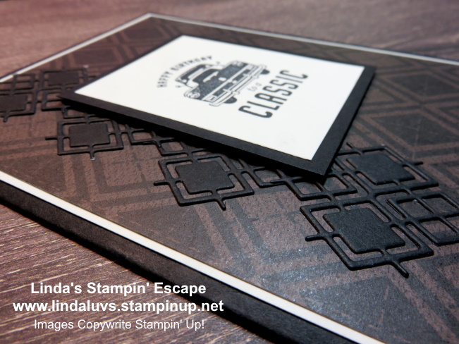 It’s a classic in every way … from the argyle pattern of designer paper to the classic car. What I love is the die cut pieces that actually aligned with the designer paper, creating a stunning pop of texture.