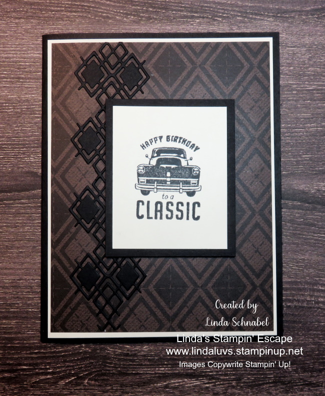 It’s a classic in every way … from the argyle pattern of designer paper to the classic car. What I love is the die cut pieces that actually aligned with the designer paper, creating a stunning pop of texture.