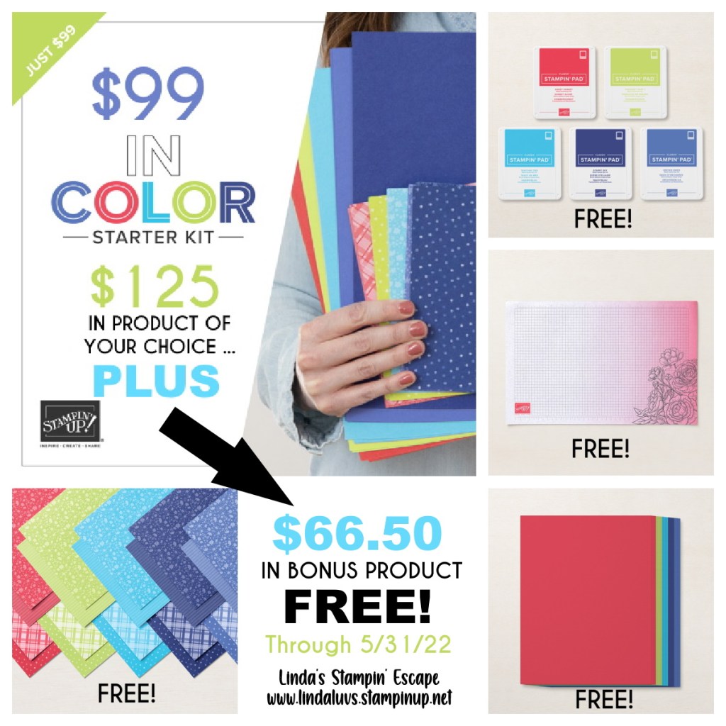 You can also collect points for joining my team / purchasing the Starter Kit with all the marvelous NEW In-Colors. Just check out this deal …. You choose $125 worth of products from the catalogs, then Stampin’ Up! will add in the 5 NEW In Color Ink Pads, the coordinating Cardstock and Designer Paper, plus a stamp pad for you to stamp on!! OH WAIT … that not all, did I mention FREE Shipping too!! A value of over $190 for ONLY $99. Amazing!