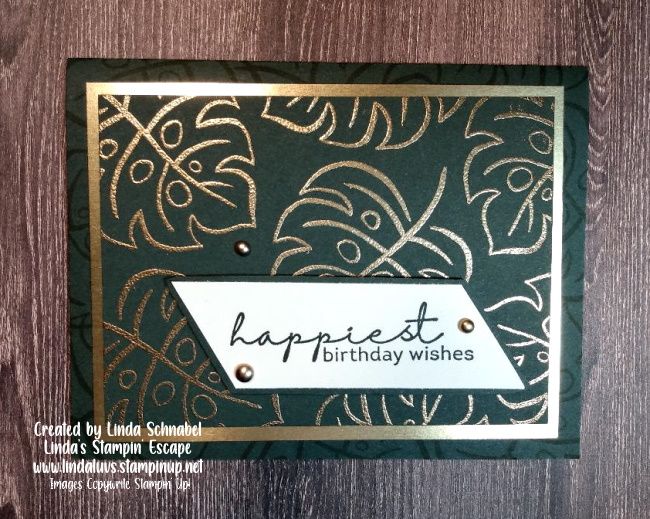 Once embossed, I layered it onto a 5-1/4″ x 4″ piece of Gold Foil paper. I usually cut out leaves or the mat for my greeting out of the center of the gold as not to waste any (can’t see that part anyway!!