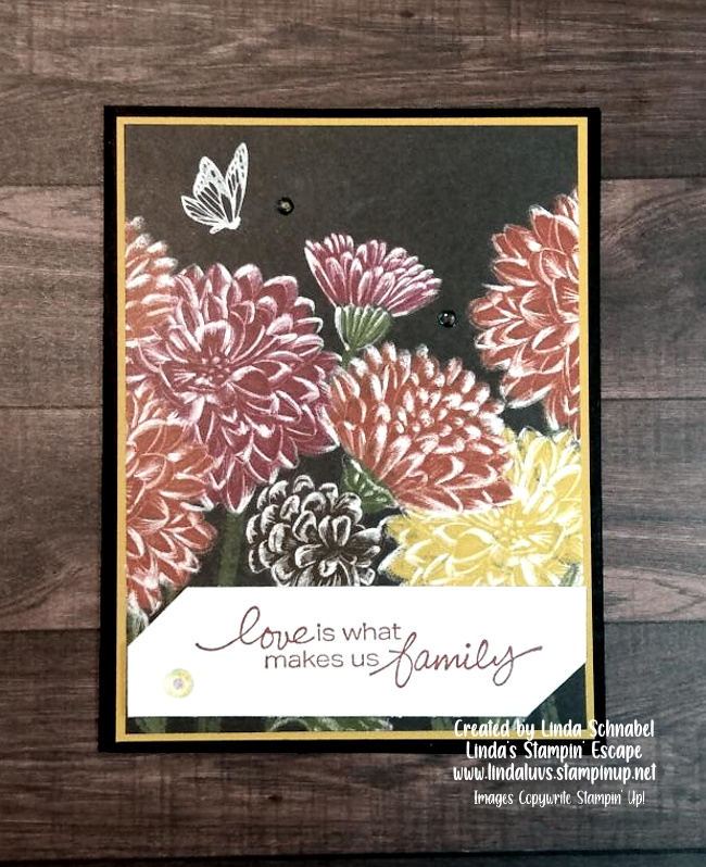 The majority of this card is designer paper, the beautiful pattern makes cardmaking a breeze. Even the butterfly is designer paper!! I matted the designer paper with Crushed Curry and then mounted it onto the Basic Black card base.