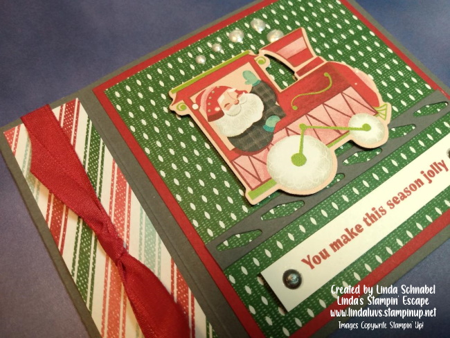 I love that Stampin’ Up! has dies that cut out elements from our designer papers because they are just sooo cute! The Santa comes from all over the world. I also used the dies for the train tracks … they thought of everything!!