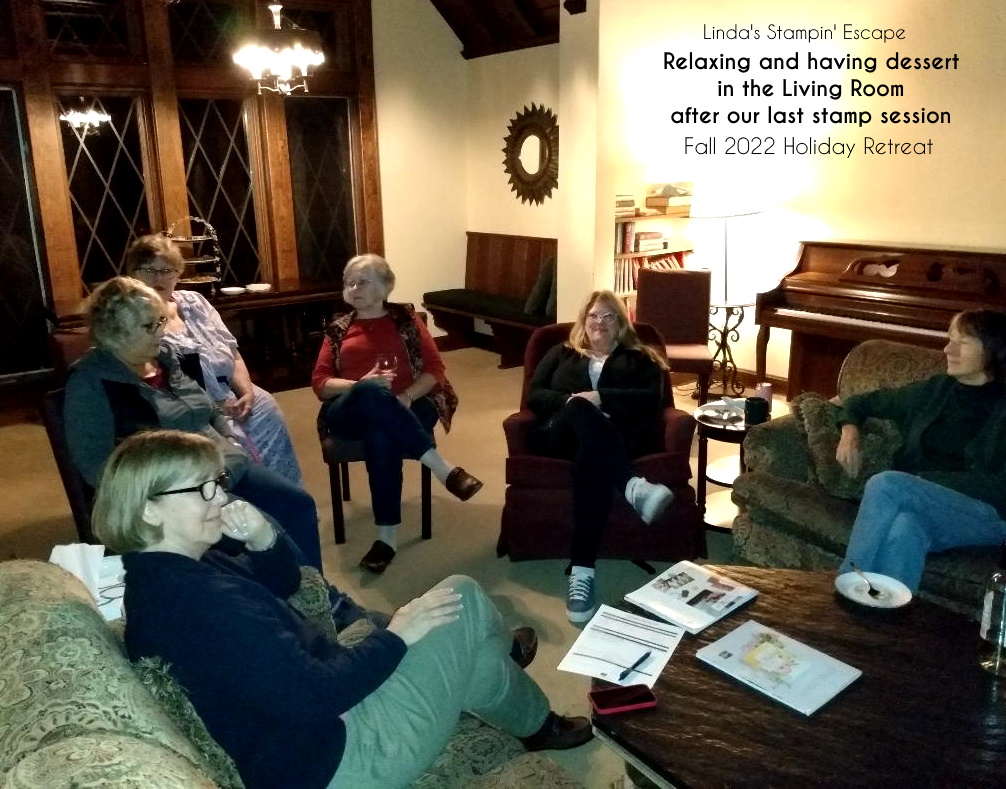 Here’s a pic of part of the gang (couldn’t get them all in this one shot) relaxing after our stamping session in the living room …