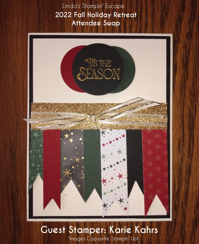 Karie used the fun and festive Lights Aglow designer paper to create her banner card. I love this style of card …. it is so versatile.