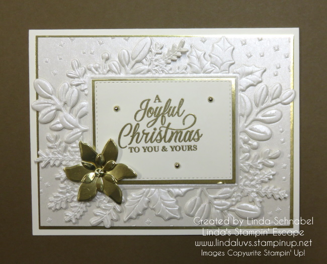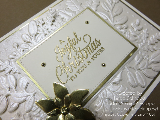 On top of the die cut foliage is another layer of Gold Foil and then I embossed the greeting onto the card. A poinsettia was die cut for added texture and design. To complete my card, I added some of the gold “Festive Pearls.