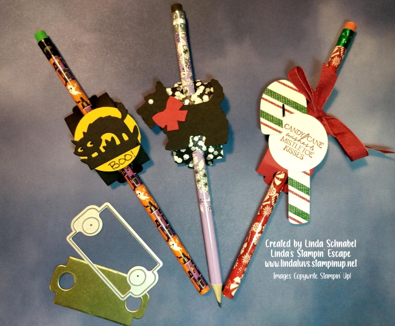 Talk about a quick and easy little gift to give … and inexpensive. I used scrap pieces to cut my little wraps out and the pencils were from the $$tore! I think there are about 8 pencils in each pack, and they always have them for special occasions.
