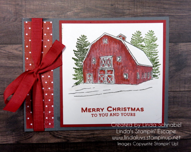 Today I’m going to share one of my heartfelt favorites that hit the retirement list … Christmas Barn. This set brings feelings of my grandparents. I also created this card using the Book Binder Fun Fold, so I will be sharing one of my demonstration videos with you. I will be sharing it with you today, along with close-ups and dimensions shared in the video. The Book Binder Fun Fold is so easy to make but gives you that special touch of fun … and it works great with any occasion!!
