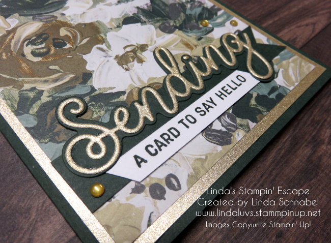 My card base is Evening Evergreen and my mat for the “same” Fancy Flora designer paper is the Gold Fine Shimmer paper. I also replaced the ribbon with a Evening Evergreen banner. Yesterdays card was “stamped” onto the Soft Succulent, where today I used Evening Evergreen and cut my Gold from the center of my mat (paper saving technique).