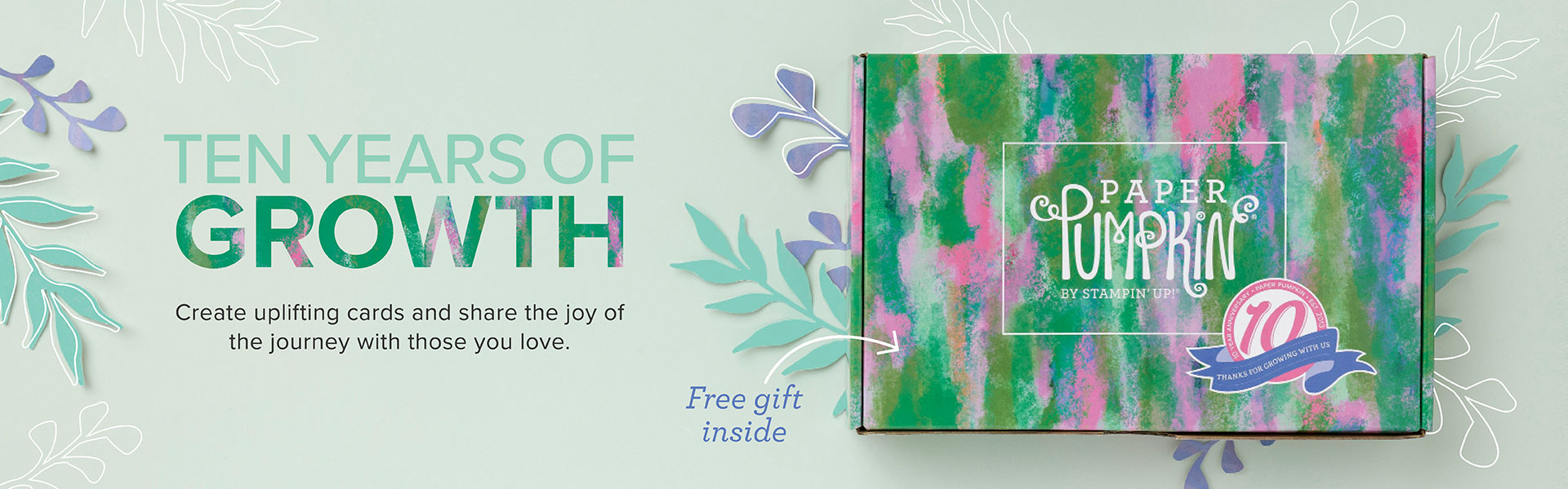 It’s Paper Pumpkin’s 10-year anniversary and we want to celebrate how much we’ve grown! This month’s kit is all about happy greetings, organic and botanical designs digitally painted by our in-house artists, along with all-occasion sentiments to celebrate the happy moments in life and recognize the people around you who help you grow!