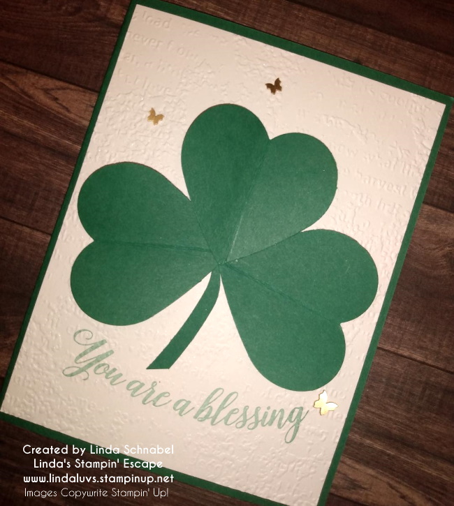 Are you in need of a quick St. Patrick’s Day card? I have the answer for you … all you need is a Heart Punch or die. I’m using the smaller heart from the Heart Punch Pack and some Shaded Spruce cardstock … punch 3 hearts and score (or fold) in the center to create some texture.
