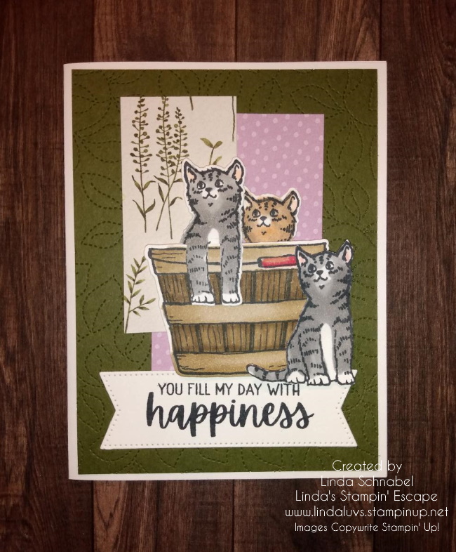 This card was just fun to make … especially if you like coloring and building with layers! Almost as fun as a basket full of kitties. I’ll be sending this card to my granddaughter because she fills my day with happiness, and she loves her kitties!!